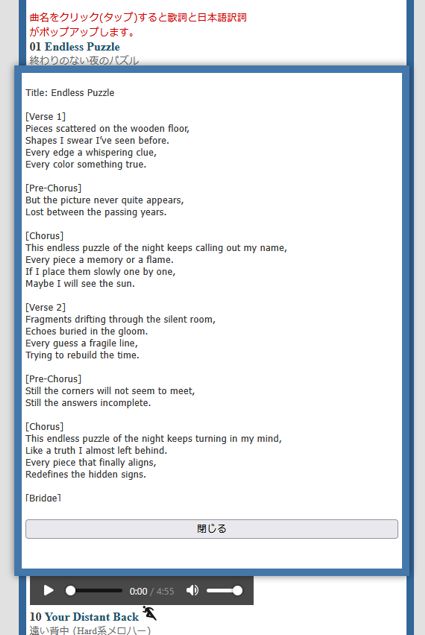 2026.03.22 MyCar」のMusicの2ndから7thアルバムの全曲の歌詞と日本語訳詞をポップアップ表示できるようにしました。